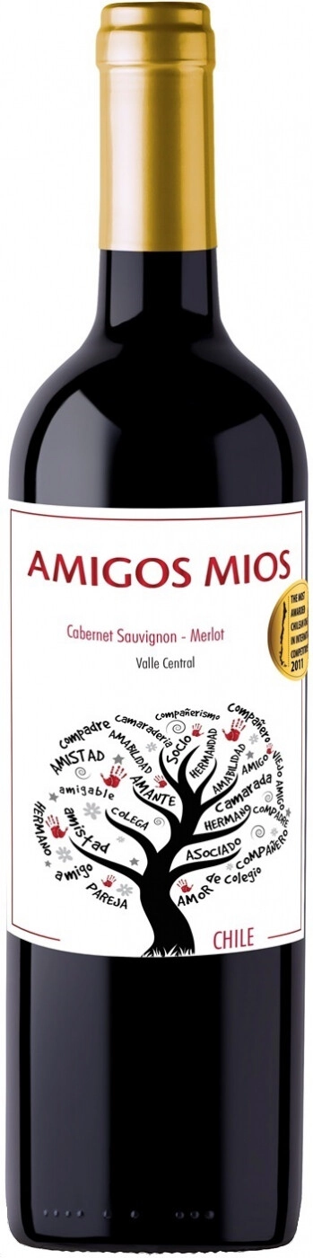 "Amigos Mios" Cabernet Sauvignon-Merlot — красное сухое вино, созданное из купажа двух сортов винограда — Каберне Совиньон и Мерло. Ягоды произрастают на виноградниках в Центральной Долине. После сбора урожая ягоды подвергаются традиционной винификации, проходящей со строгим температурным контролем. Потенциал вина составляет 2-3 года. Это вино отлично дополнит дружеские посиделки.