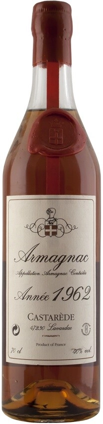"Castarede" Armagnac, 1962 — арманьяк с великолепным, многогранным вкусом и незабываемым ароматом. Он изготовлен из белого вина, произведенного из белого винограда с повышенной кислотностью и низким содержанием алкоголя. Перегонка происходит методом одинарной дистилляции и длится всю зиму вплоть до 31 марта. Далее следует процесс старения, что является важнейшим этапом в изготовлении арманьяка "Castarede": арманьяк помещают в 400-литровые дубовые бочки ручной работы, выжженные изнутри. Кроме этого, для старения немаловажным условием являются изотермические условия и микроклимат. Винтаж 1962 года завоевал серебряную медаль на конкурсе "International Wine & Spirit Competition, 2003".